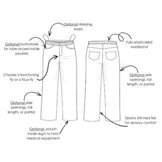 Our Amelia Jeans (Ambulatory version) are drafted to standing measurements and have a number of features designed with the ambulatory wearer in mind. All optional access elements can be added in or left out so the finished garment works exactly how the wearer needs it to.