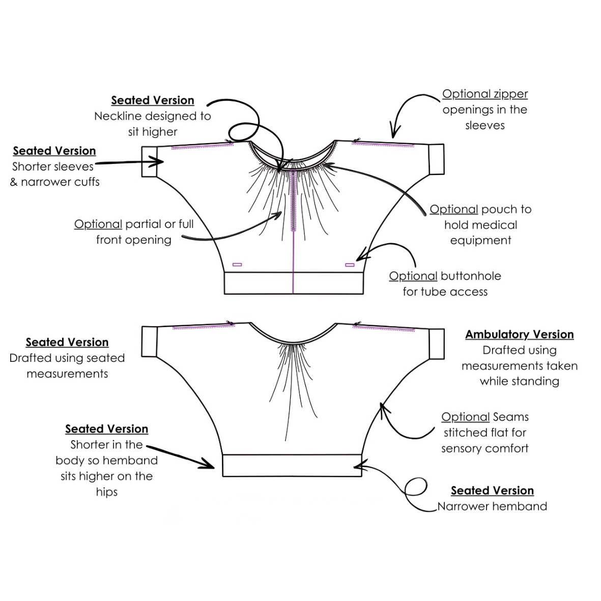 Our Anna Maria Batwing Top (Ambulatory version) is drafted to standing measurements and has a number of features designed with the ambulatory wearer in mind. All optional access elements can be added in or left out so the finished garment works exactly how the wearer needs it to.
