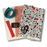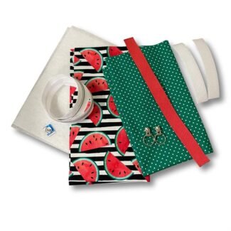 Kit includes main fabric, lining fabric, adhesive fleece wadding, 25mm wide webbing, 32mm wide webbing, 2 x D rings, 1 x strap separator, 1 x swivel clip, cord, 1 x bag strap clip, plus full dyslexia friendly instructions and template.